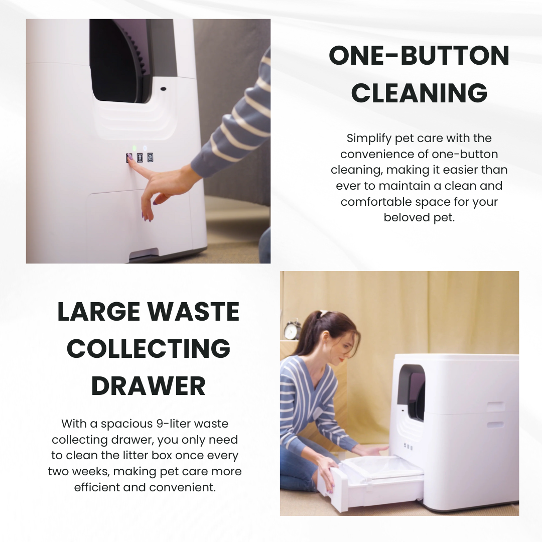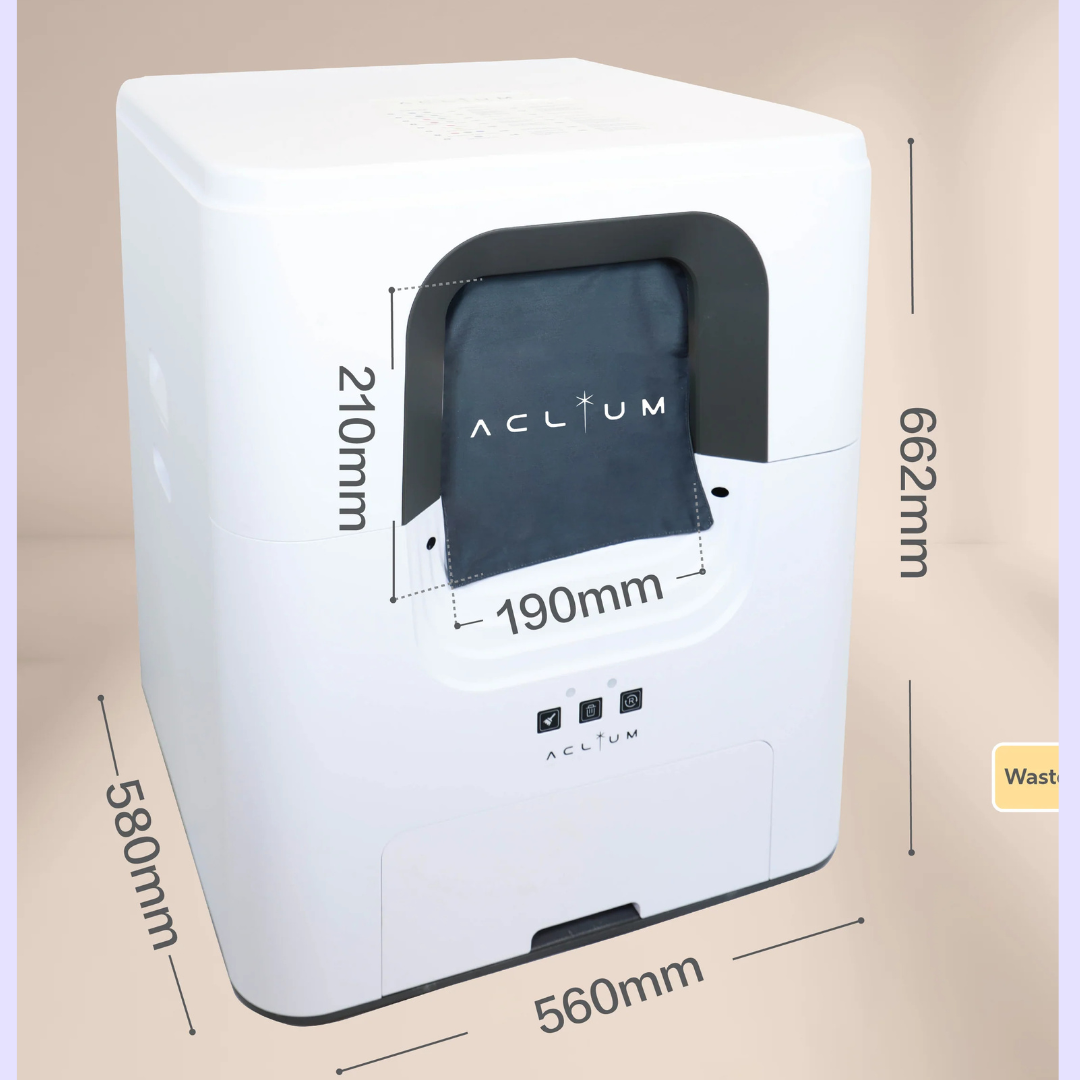 With fragrance inserts on both sides and a clumping litter system, the Aclium Automatic Cat Toilet Box ensures a fresh-smelling environment throughout the day. The machine is simple to operate—press the trash symbol button to empty the litter automatically. Its smart design reduces cleaning time, prevents litter tracking, and maintains a neat space for both you and your pet.