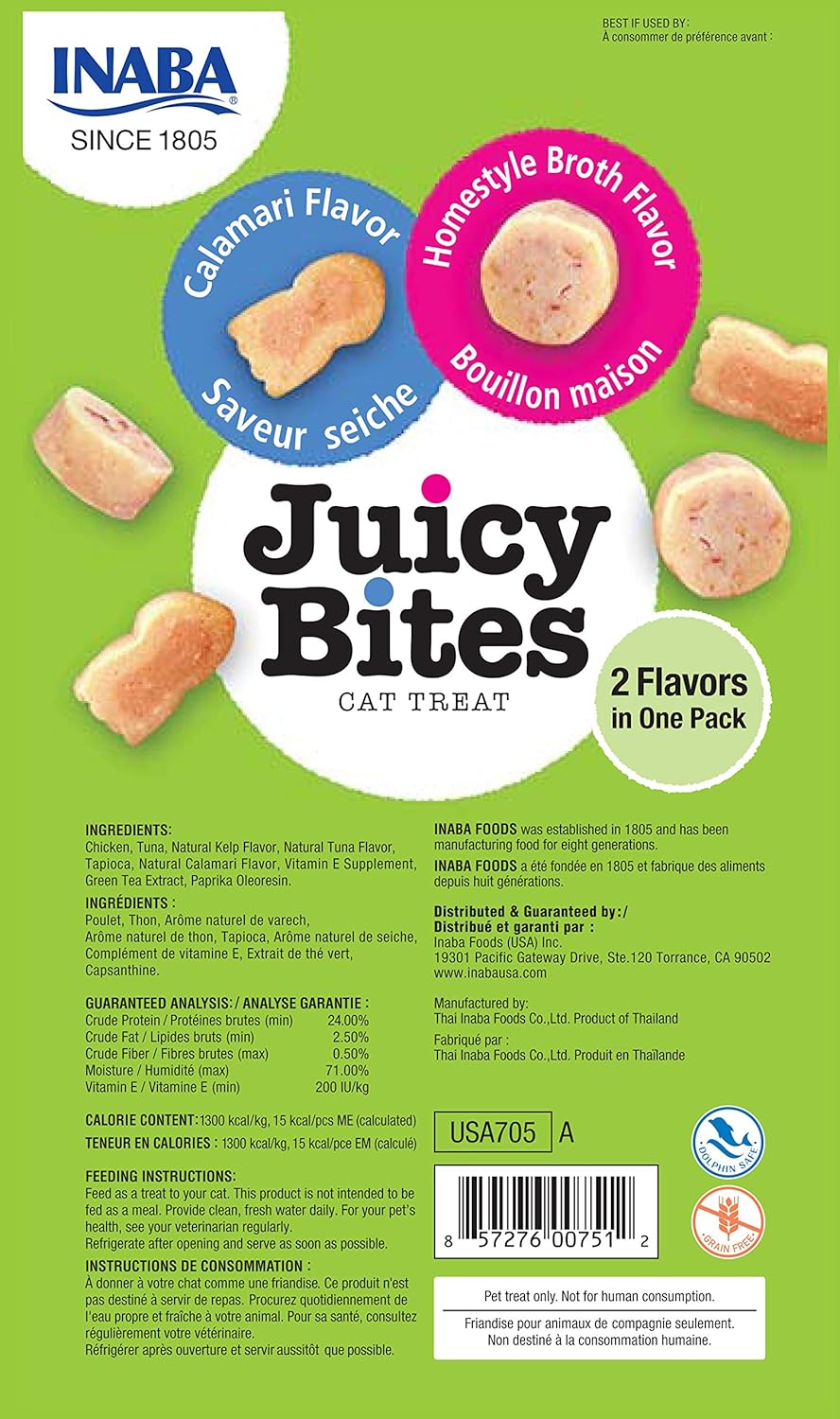 Inaba Juicy Bites Homestyle Broth with Calamari Flavor offers your cat a moist, delicious treat packed in convenient pouches. Each pack contains three 11.3g pouches filled with savory broth and tender calamari pieces that cats love.