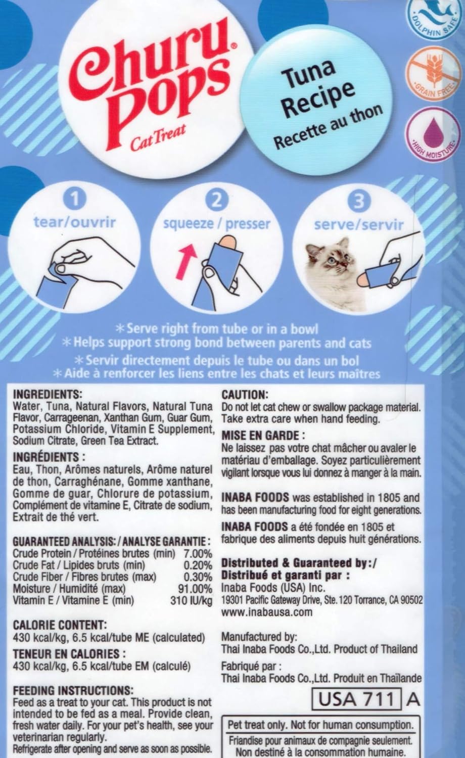 Churu Tuna Cat Treat Pop contains no artificial colors, preservatives, or grains, making it suitable for cats with sensitive stomachs or allergies. The treat is enriched with essential nutrients such as taurine, which supports heart health and vision, and Omega-3 and Omega-6 fatty acids that promote a shiny, healthy coat.