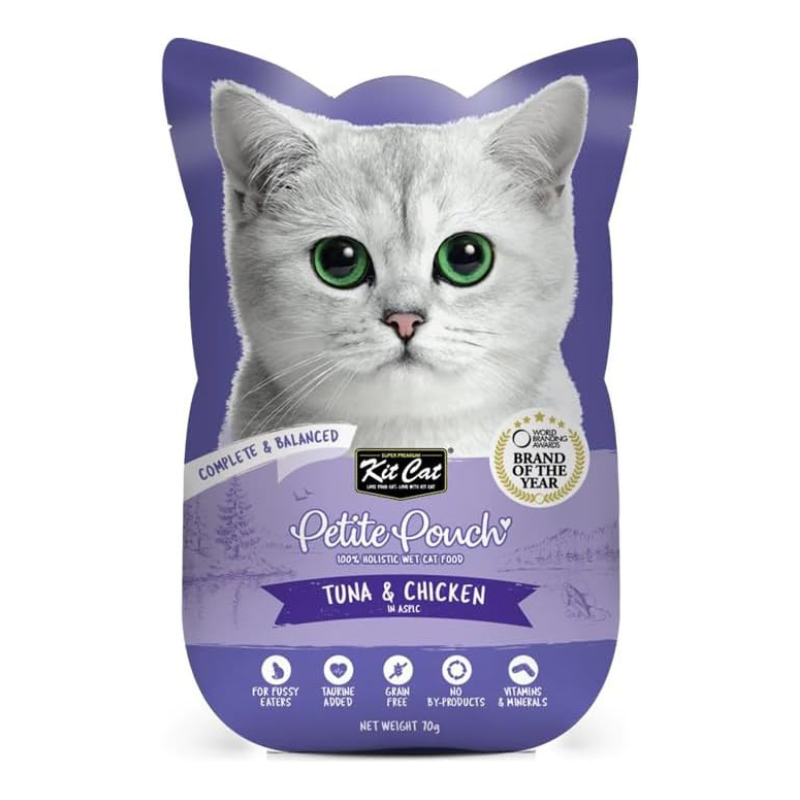Give your cat a tasty and balanced meal with Kit Cat Petite Pouch Wet Cat Food with Tuna & Chicken in Aspic – 70g. This dual-protein recipe blends premium tuna and tender chicken in a smooth aspic jelly that cats find irresistible.