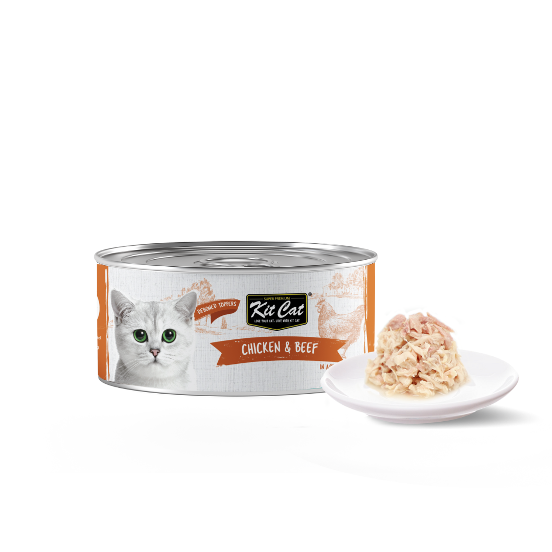 Give your cat a protein-packed meal with Kit Cat Chicken & Beef wet food toppers. Made with real deboned chicken paired with tender beef, this recipe delivers a tasty and nutritious dining experience for your feline friend.