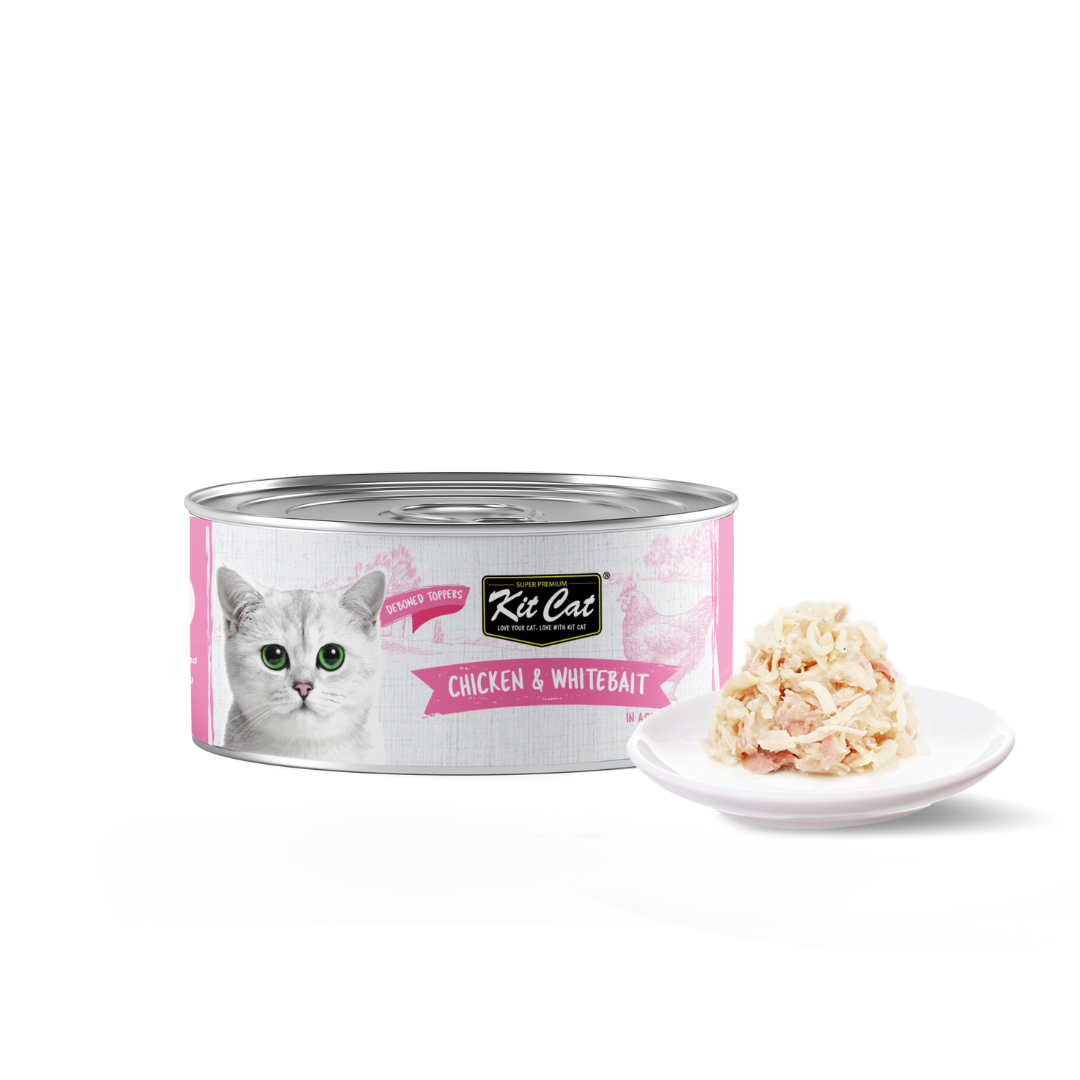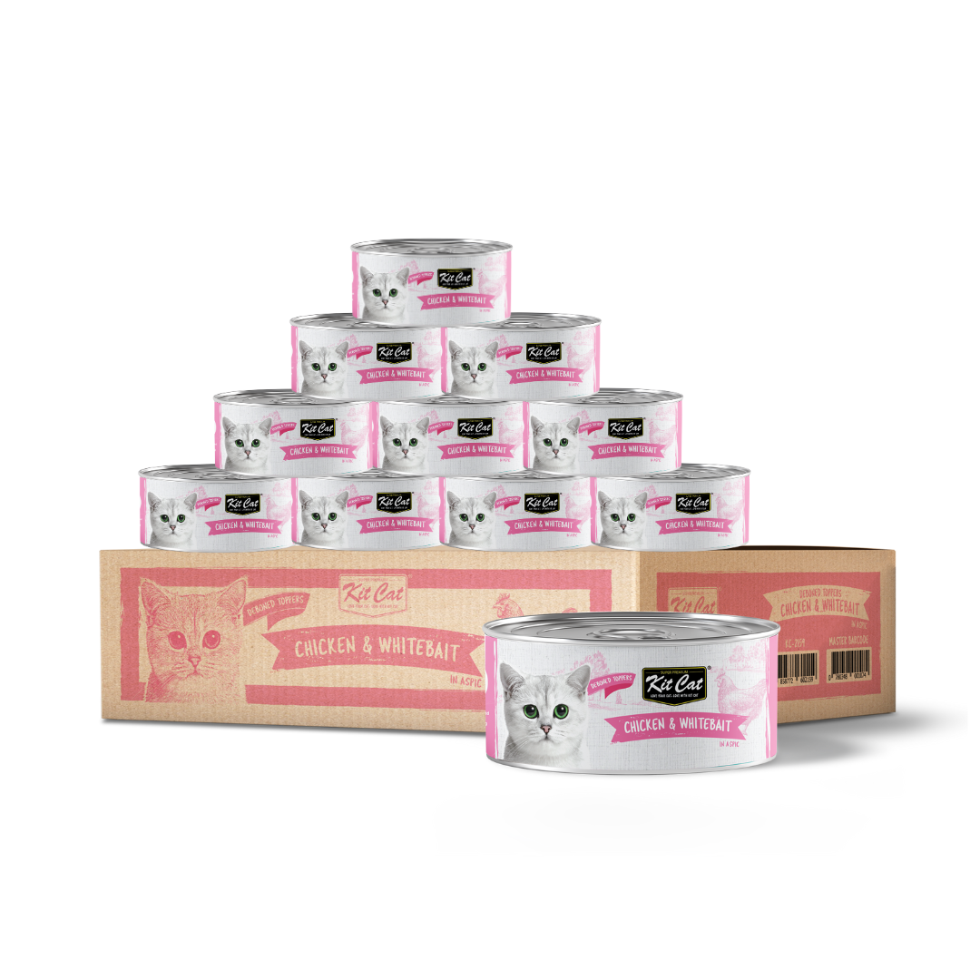 Delight your cat with the delicious Kit Cat Chicken Mousse, featuring tender deboned chicken topped with crispy whitebait pieces. This premium wet cat food provides a protein-rich, nutritious meal that supports strong muscles, healthy skin, and a shiny coat. The smooth mousse texture is easy for cats of all ages to enjoy, while the whitebait toppers add a crunchy, flavorful twist to each bite.