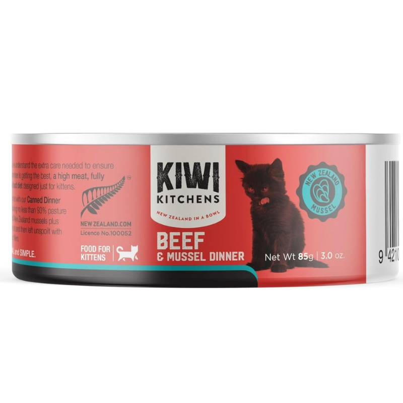 Give your kitten a powerful start with Kiwi Kitchens Beef & Mussel Dinner Canned Wet Kitten Food 85G. This high-protein meal features grass-fed New Zealand beef and green-lipped mussels, both packed with essential nutrients for healthy growth and development.