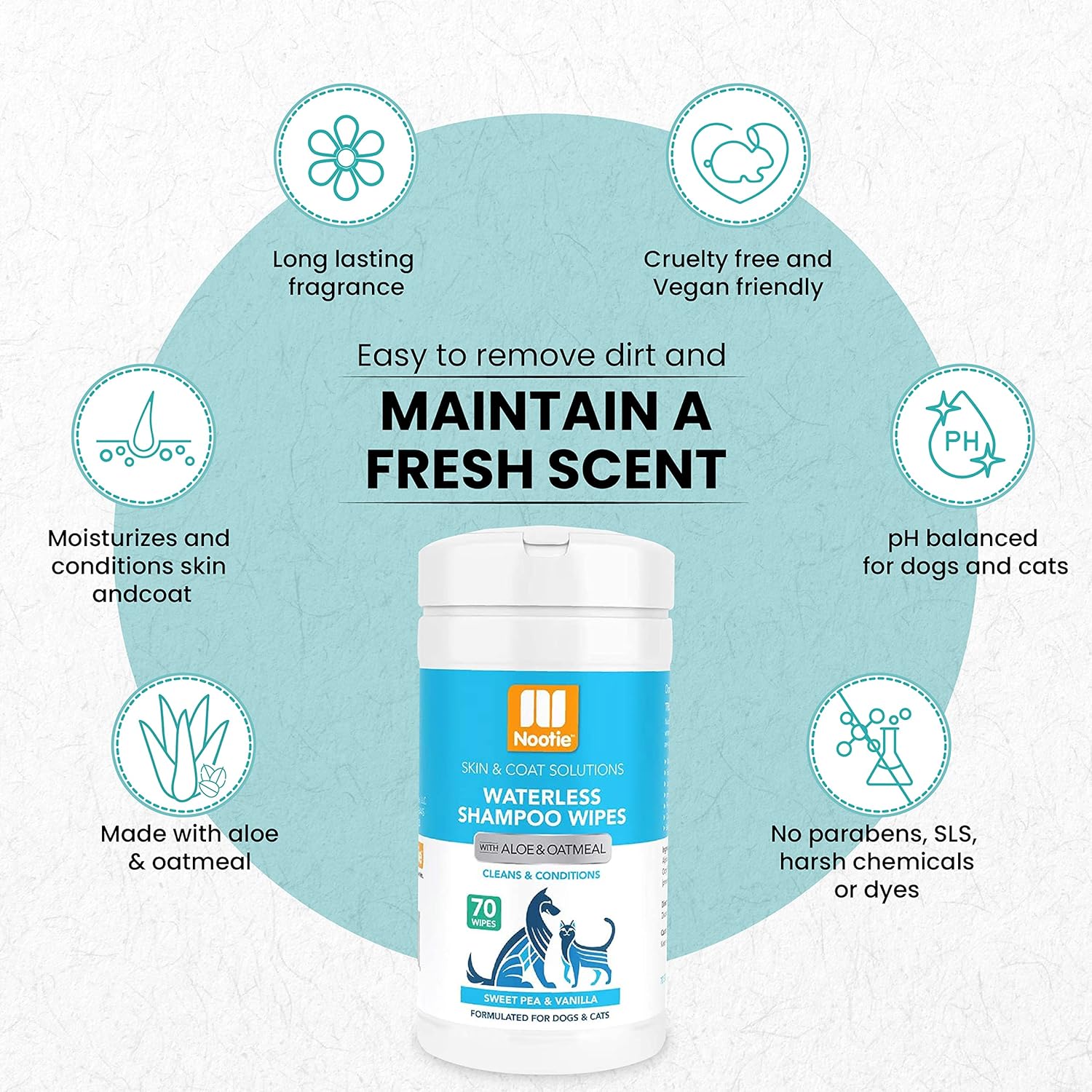 Nootie Waterless Shampoo Pet Wipes – Sweet Pea & Vanilla Scent, 70 Wipes for Dogs & Cats