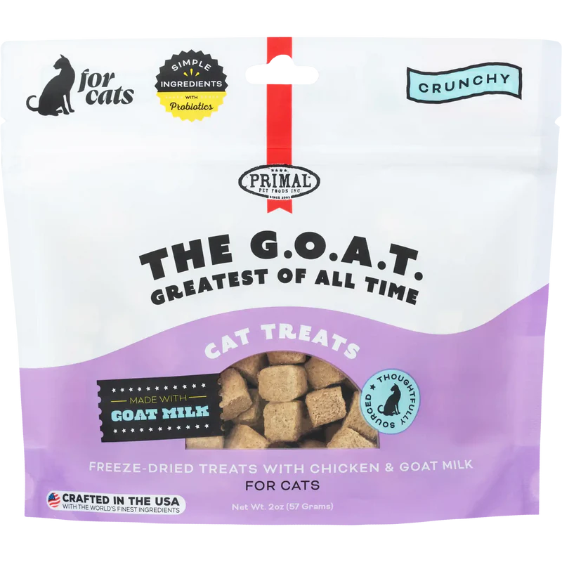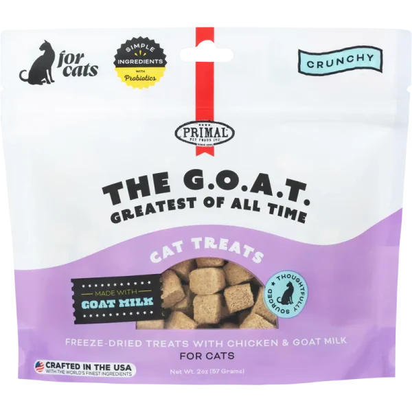 Primal The G.O.A.T. – Chicken & Goat Milk – for cats! Freeze-Dried Treat is blended with probiotics for immunity support, we think your cat will agree: these treats are the Greatest of All Time.