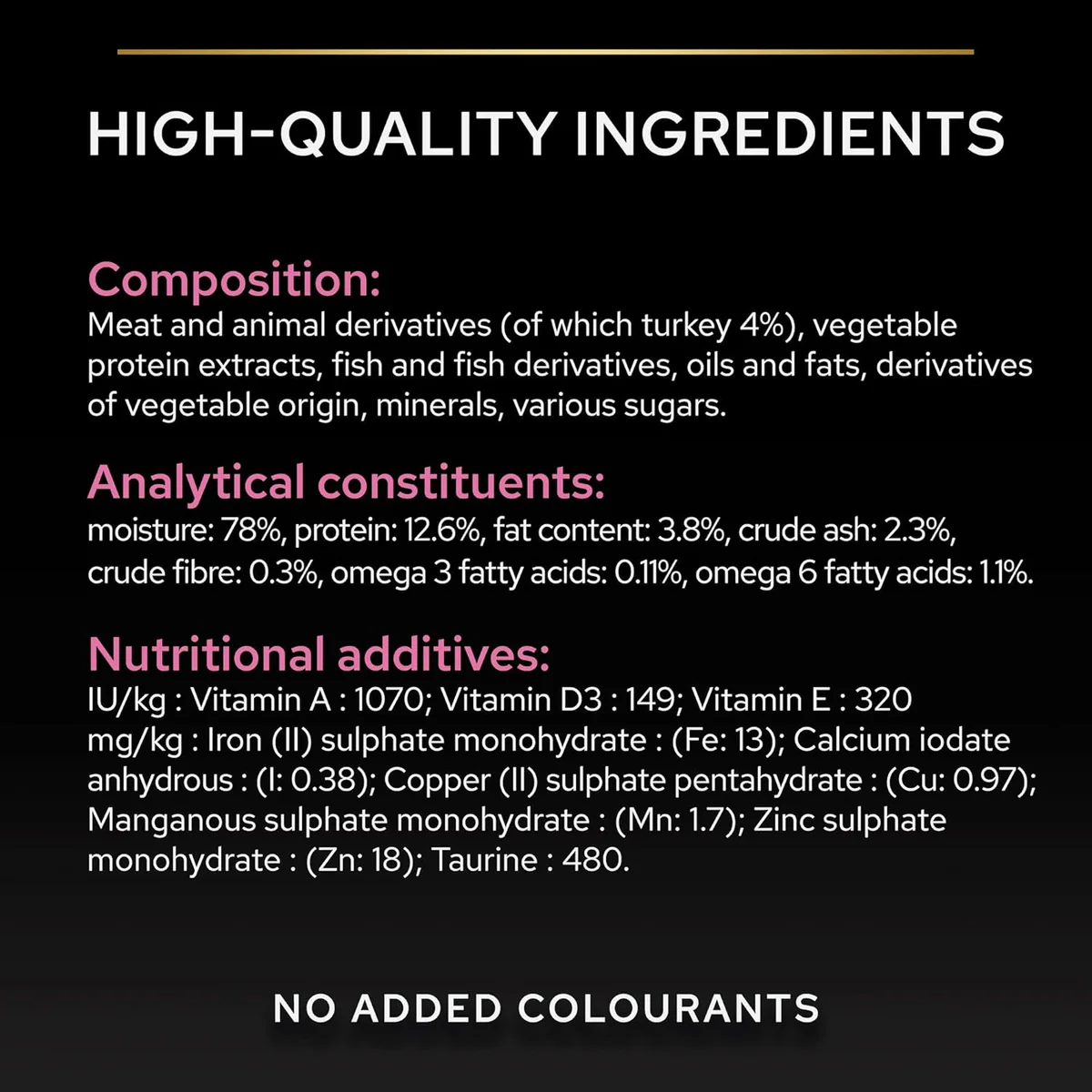 With turkey: Meat and animal derivatives (of which 4% turkey), vegetable protein extracts, fish and fish derivatives, oils and fats, derivatives of vegetable origin, minerals, various sugars.