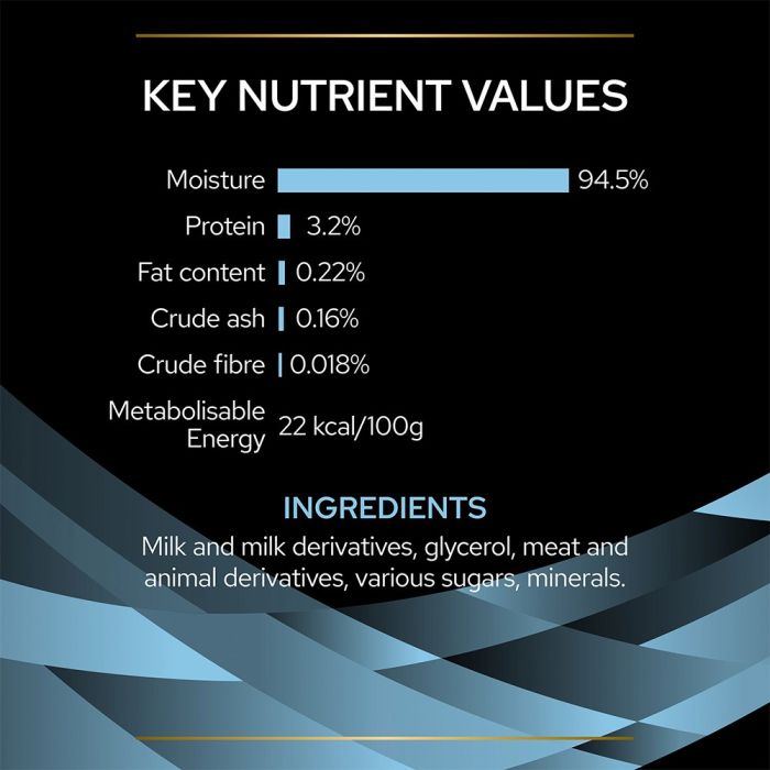 Purina Pro Plan Hydra Care Feline has a high moisture content and can help to increase your cat’s daily water intake. Sufficient fluid intake is essential for overall wellbeing and healthy urinary tract function. This moist snack has a deliciously soft jelly and a great flavour that even fussy cats won’t be able to resist.