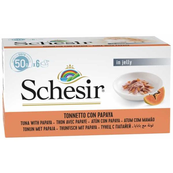 A Schesir recipe based on real tuna fillets , combined with real papaya pieces , for an exotic and original meal . The ingredients are prepared in jelly , to satisfy the taste of cats who prefer a natural flavor , but with a more compact consistency in the bowl. Schesir was the first brand to insert real pieces of fruit in cans for cats , using the results of a study conducted in collaboration with the Department of Veterinary Medical Sciences – Alma Mater Studiorum University of Bologna . The practical multipack of 6 portions of 50 gis the ideal solution to avoid waste!