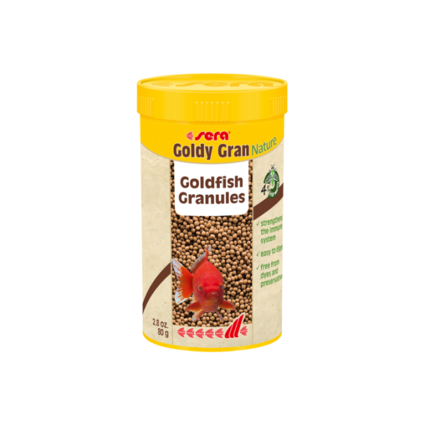 sera Goldy Gran Nature is the staple food consisting of gently manufactured granules without dyes and preservatives for bigger goldfish and other fastidious cold water fish.