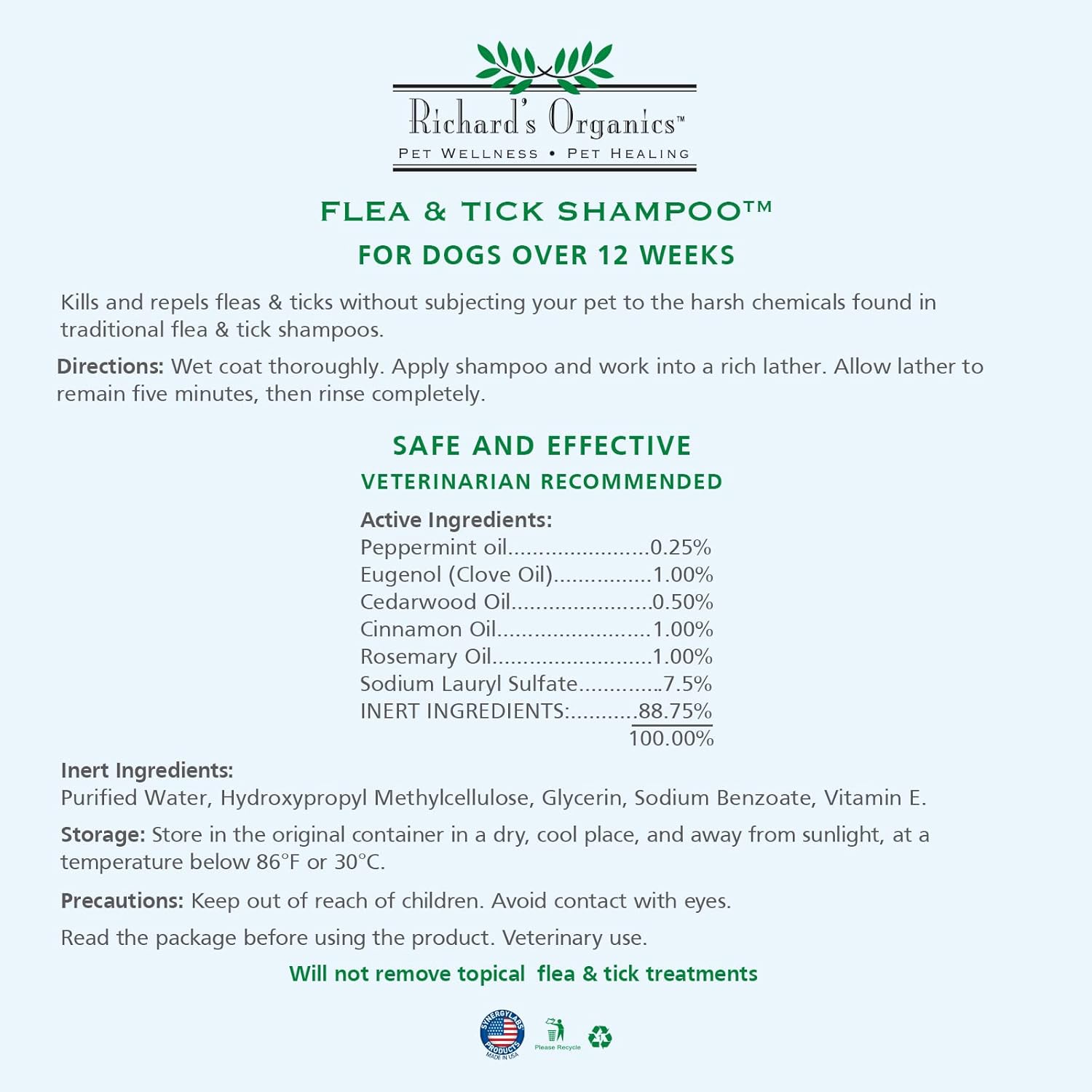 Synergy Labs Richard’s Organics Flea & Tick Shampoo – 354 ml is a 100% natural, soap- and paraben-free formula designed to kill fleas and ticks on contact while also repelling mosquitoes for up to 6 weeks . Enriched with pure essential oils—cinnamon, clove, cedarwood, peppermint, and rosemary—plus vitamin E, lanolin, and lecithin, it soothes irritated skin and leaves your dog smelling fresh .