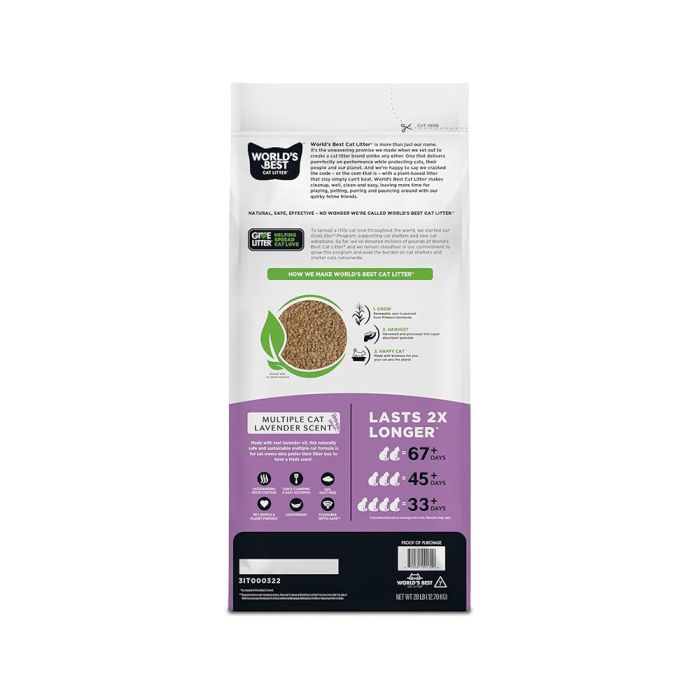 Smell the flowers, not the litter box, with this 100% natural, dust-free cat litter. We took the outstanding odor control and quick clumping, easy scooping cleanup of our Multiple Cat Clumping Formula, and added 100% all-natural scented lavender oil for a fresh floral fragrance. No synthetic chemicals or perfumes. The concentrated power of corn means it’s silica dust free, and proven flushable for easy cleanup. Ideal for homes with two or more cats.